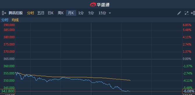 智通财经APP获悉,腾讯(00700)将于本周三(3月18日)披露年报。该股午后跌幅扩大至6%,拖累指数170点,截至14时17分,跌6.08%,报价342.8港元,成交额105.9亿。