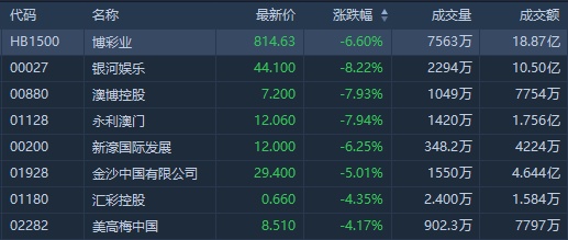截至发稿,银河娱乐(00027)跌8.22%,报44.1港元;永利澳门(01128)跌8.09%,报12.04港元;澳博控股(00880)跌8.06%,报7.19港元;金沙中国有限公司(01928)跌5.33%,报29.3港元。