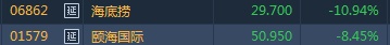 智通财经APP获悉,火锅概念尾盘跌幅扩大,海底捞(06862)挫逾10%,跌破所有均线。截至15时34分,海底捞跌10.94%,报价29.7港元,颐海国际(01579)跌8.45%,报50.95港元。