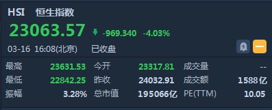截至收盘,恒生指数跌969.34点或4.03%,报23063.57点,全日成交额达1588.05亿。国企指数跌4.38%,报9227.6点,红筹指数跌4.6%,报3480.54点。