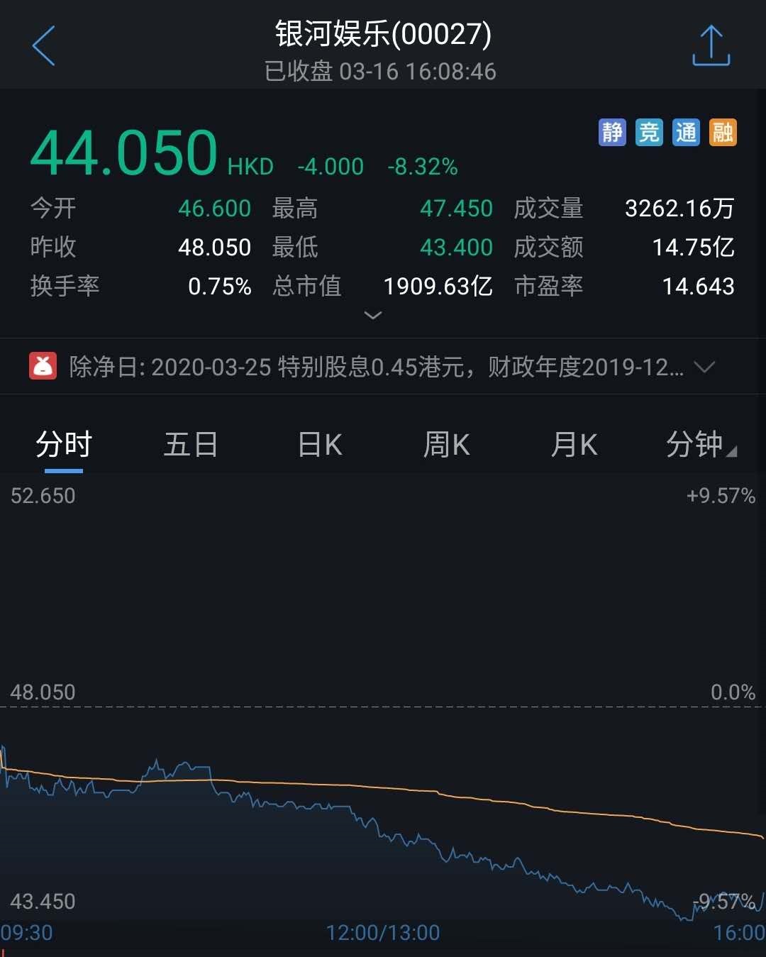 截至发稿,银河娱乐跌8.32%,报44.05港元。