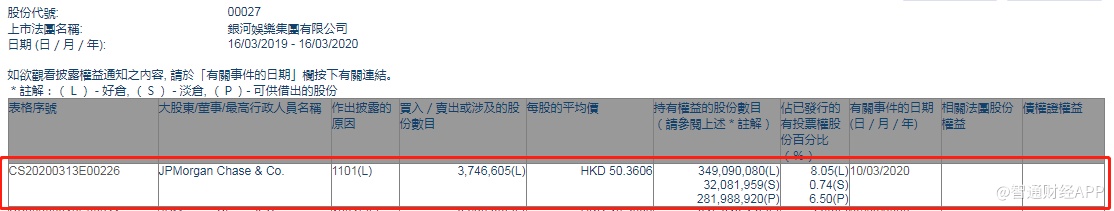 智通财经APP获悉,联交所最新资料显示,3月10日,摩根大通增持银河娱乐(00027)约374.66万股,每股作价50.3606港元,总金额约为1.89亿港元,增持后持股数目为3.49亿股,持股比例为8.05%。