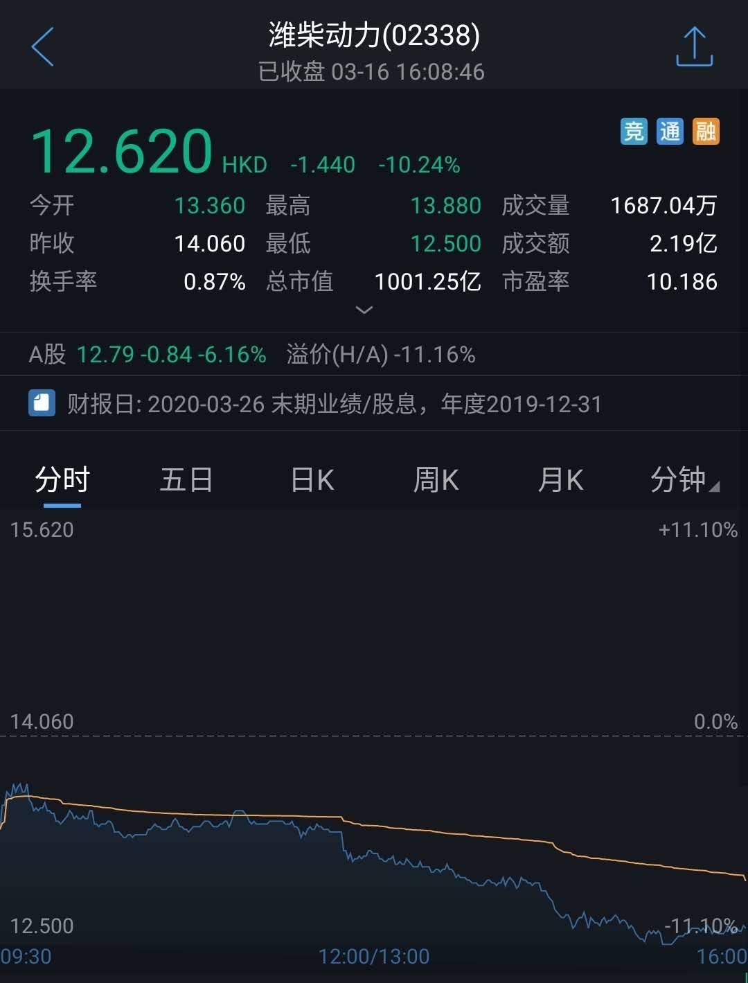 截至发稿,潍柴动力跌10.24%,报12.62港元。