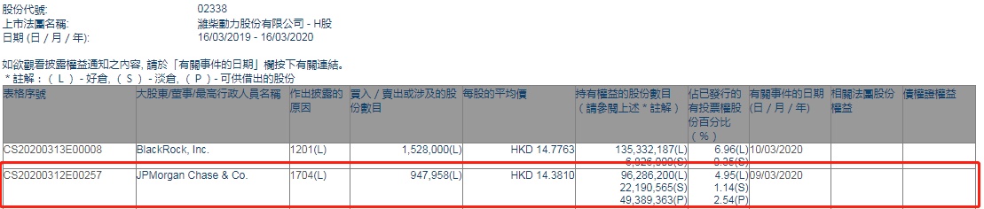 智通财经APP获悉,联交所最新资料显示,3月9日,摩根大通减持潍柴动力(02338)约94.8万股,每股作价14.3810港元,总金额约为1363.32万港元,减持后持股数目为9628.62万股,持股比例为4.95%。