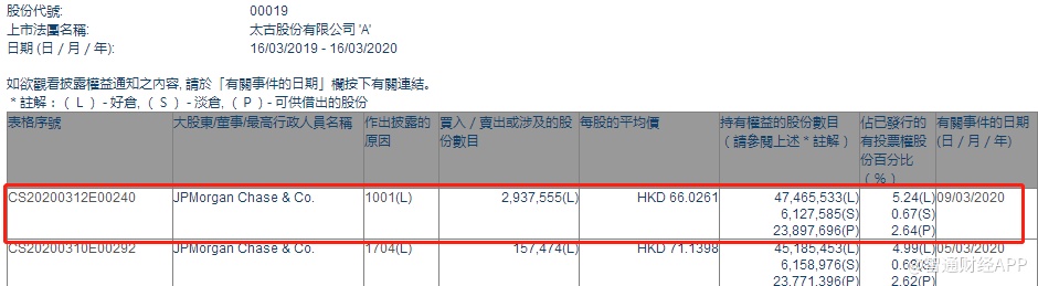 智通财经APP获悉,联交所最新资料显示,3月9日,太古股份公司A(00019)获摩根大通增持约293.76万股,每股作价66.0261港元,总金额约为1.94亿港元,增持后持股数目约为4746.55万股,持股比例为5.24%。