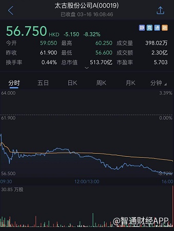 截至收盘,太古股份公司A跌8.32%,报56.75港元。
