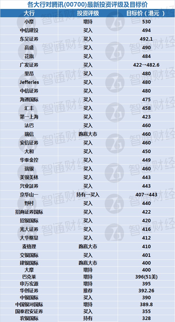 八、各大行对腾讯(00700)最新投资评级及目标价