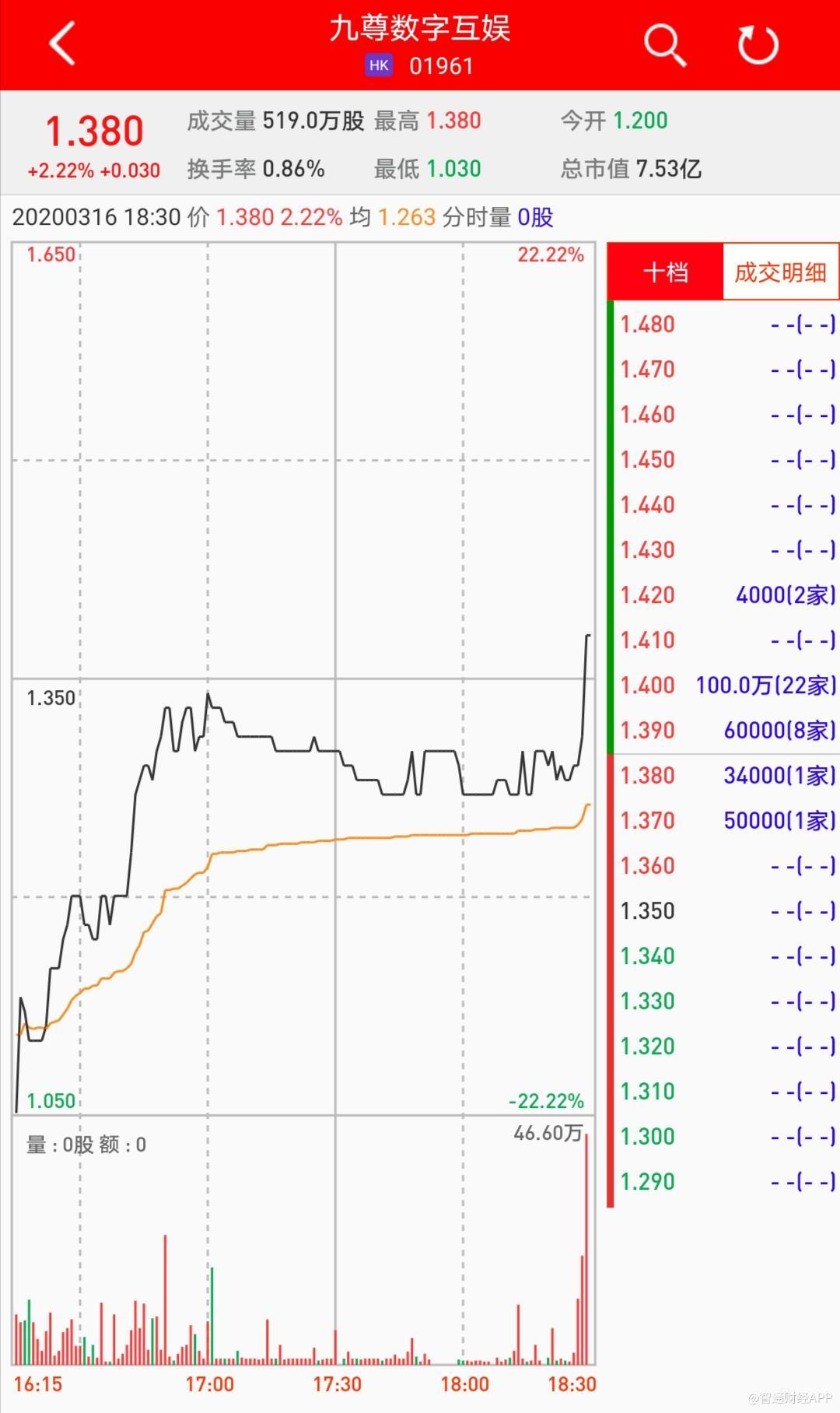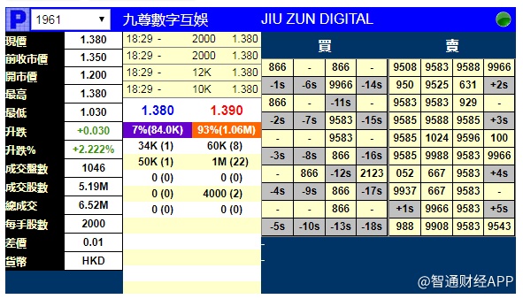 智通财经APP获悉,九尊数字互娱(01961)将于3月17日挂牌,截至收盘,辉立证券暗盘交易显示其报价1.38港元,较招股价1.35港元涨2.22%。每手2000股,不计手续费,每手赚60港元。