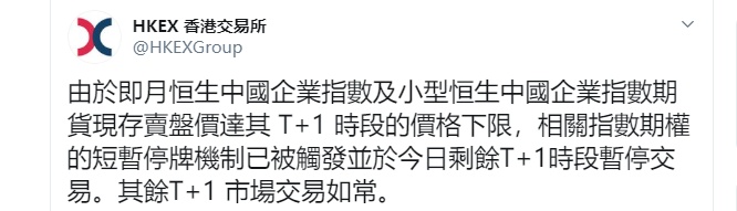 智通财经APP获悉,今日,港交所表示,由于即月恒生中国企业指数及小型恒生中国企业指数期货现存卖盘价达其 T+1 时段的价格下限,相关指数期权的短暂停牌机制已被触发并于今日剩余T+1时段暂停交易。其余T+1 市场交易如常。