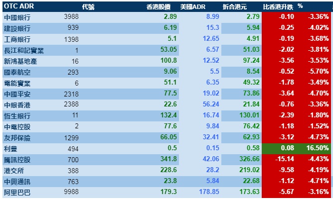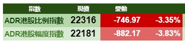 智通财经APP获悉,周一道指狂泻近3000点,创自1987年股灾以来最大单日跌幅,拖累港股ADR指数全日受压,按比例计算,收报22316点,跌746.97点。