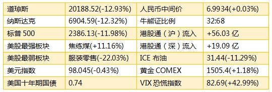隔夜美股再次遭遇重挫,三大股指收盘跌幅均达一成以上,为33年来最大跌幅,科技股重挫,中概股普遍大跌。美联储在不到两周时间内两次紧急减息,同时启动量化宽松(QE),准备购买总值7000亿美元的债券,突然大幅宽松的货币政策反而加剧市场的恐慌,VIX标普500恐慌指数昨日大涨43%至82.69,仅次于2008年次贷危机时创下的高位89.53。货币政策目前并没能制止股市的下跌,或许推出强有力的措施来控制卫生黑天鹅的蔓延才能有效降低投资者的恐慌。