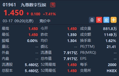 智通财经APP获悉,九尊数字互娱(01961)首日挂牌,公告显示,公司发行1.26亿股,每股定价1.35港元,每手2000股,所得款项净额1亿元。截至发稿,涨7.41%,报1.45港元,成交额1150万港元。