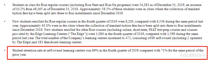 在瑞思的Q4财报中,公司也提到了公司在2019年Q4的学生留存率仅有69%,较上年同期的71%出现下滑。而在全年数据上学生留存率也从上年的70%降至69%。下滑数据虽小,但足以引起重视。
