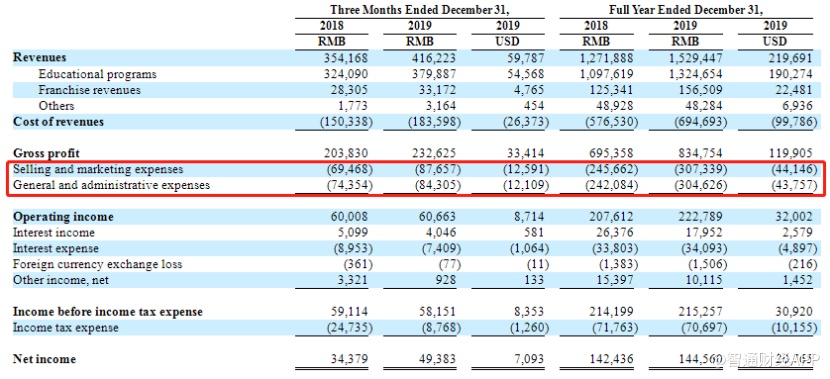 但在叠加公司的费用端后,出现了公司盈利滞后。2019年全年,公司的营销费用为3.07亿元,同比增长25.11%;行政费用为3.05亿元,同比增长25.83% 。这两项费用的年增速均超过了当期的营收增速。对此公司的解释是“这是由于教师薪资增加以及对扩大营销渠道的投资所致”。