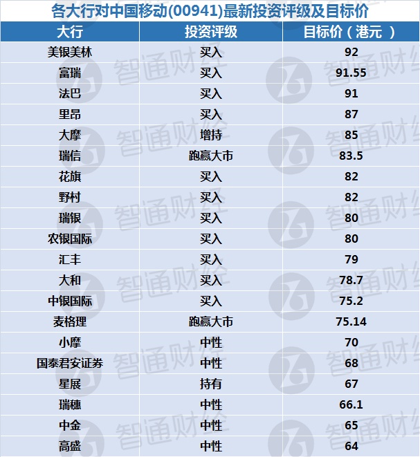 下表列出20家券商对中国移动最新评级及目标价: