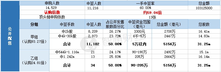 其中,公开配售申购人数14529,一手中签率60%,认购倍数约59.04倍。