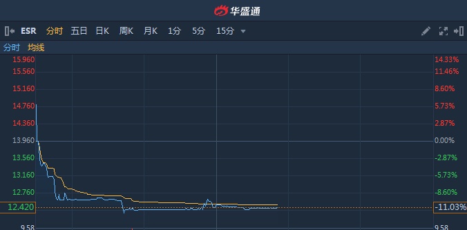 智通财经APP获悉,次新股ESR(01821)阴跌不止,近期股价连续破底,盘中低见12.3港元,再创新低,截至13时50分,跌11.03%,报价12.42港元,成交额1507万。
