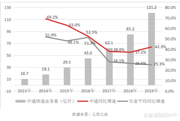 从数据来看:中通快递2019年完成业务量121.2亿件,同比增长42.3%,超出行业平均增速17个百分点。虽然中通业务量增速在2014年-2018年持续放缓,但均快于行业平均增速。