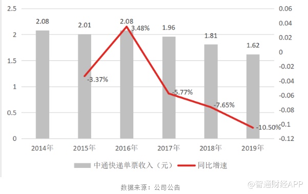 自2017年起,中通快递的单票收入进入下滑通道,且下降的幅度持续扩大。2019年,中通快递的单票收入为1.62元,同比下降10.5%。
