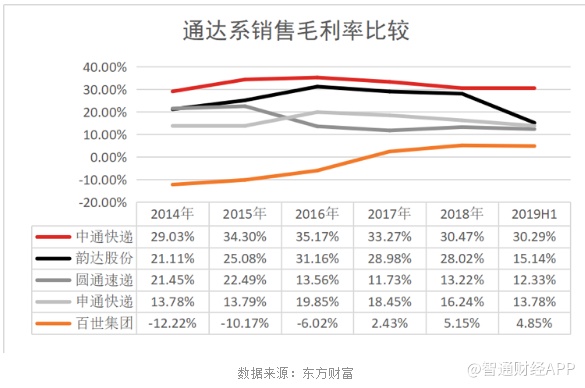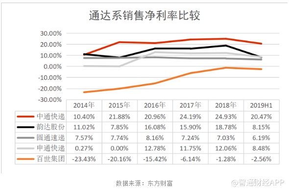 2019年,中通的销售净利率达到25.65%,同比增加0.72个百分点。自2015年起,中通的销售净利率保持在20%以上,相比通达系,具备绝对优势。