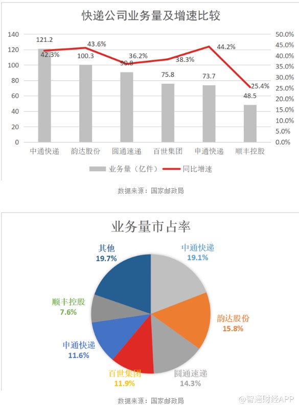 1. 规模方面,中通业务量、市占率均稳居通达系之首。