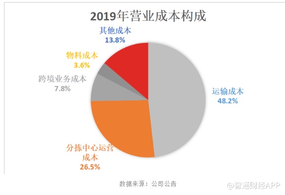 中通快递的营业成本主要由四部分构成,分别是运输成本、分拣中心运营成本、跨境业务成本和物料成本。而运输成本和分拣中心运营成本占据了74.8%,是营收成本的核心。