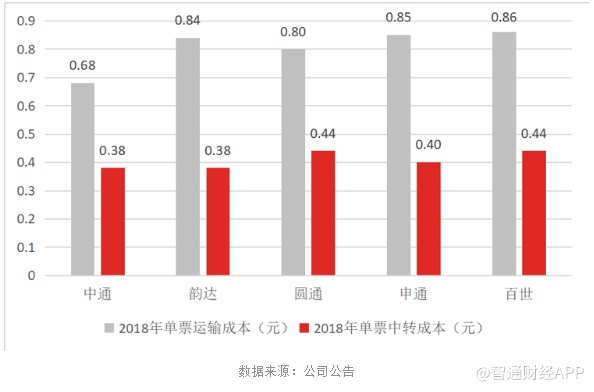 从通达系2018年单票运输成本和单票中转成本的数据来看,中通的成本均最低,分别只有0.68元和0.38元。