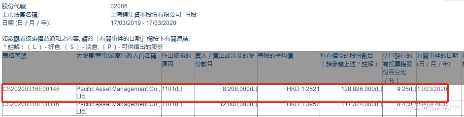 智通财经APP获悉,联交所最新资料显示,3月13日,Pacific Asset Mgt增持锦江资本(02006)820.8万股,每股作价1.2521港元,总金额约为1027.72万港元,增持后持股数目约为1.29亿股,持股比例为9.26%。
