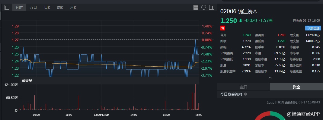 截止今日收盘,锦江资本(02006)跌1.57%,报1.25港元。