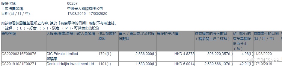 智通财经APP获悉,联交所最新资料显示,3月11日,GIC Private Limited减持中国光大国际(00257)253.6万股,每股作价4.8373港元,总金额约为1226.74万港元。减持后最新持股数目约为3.06亿股,最新持股比例为4.98%。