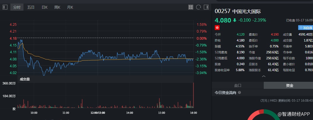 截至今日收盘,中国光大国际(00257)跌2.39%,报4.08港元。