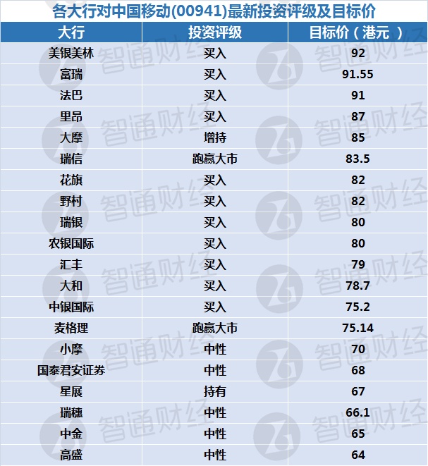 七、各大行对中国移动(00941)最新投资评级及目标价