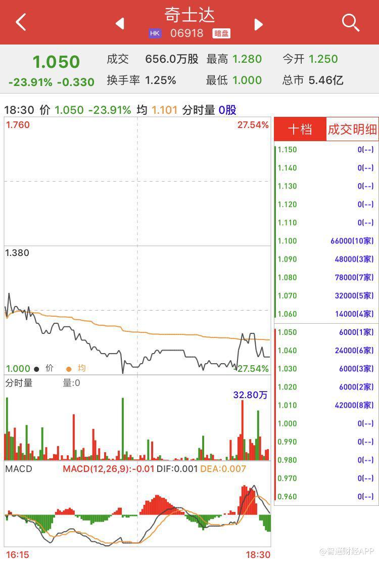 智通财经APP获悉,奇士达(06918)将于3月18日挂牌,截至收盘,辉立证券暗盘交易显示其报价1.05港元,较招股价1.38港元跌23.91%。每手2000股,不计手续费,每手亏660港元。