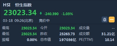 智通财经APP获悉,恒生指数开盘跌240.39点或1.03%,报23023.34点。国企指数跌1.41%,报9086.35点。红筹指数跌1.31%,报3400.79点。大市盘前成交31.22亿港元。