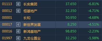 截至14时15分,长实集团(01113)跌6.81%,报价37.65港元,长和(00001)跌4.68%,恒基地产(00012)跌4.71%,新世界发展(00017)跌4.5%,九龙仓置业(01997)跌2.23%。