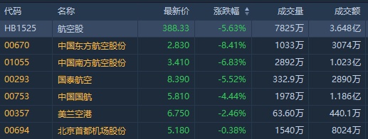智通财经APP获悉,香港航空股板块今日午盘整体下挫,截至北京时间14:35,中国东方航空(00670)跌8.41%,中国南方航空股份(01055)跌6.83%,国泰航空跌(00293)跌5.52%,中国国航(00753)跌4.44%,美兰空行(00357)跌6.75%,北京首都机场(00694)跌0.38%。