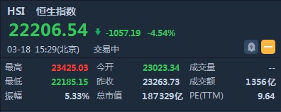 截至15时29分,恒指跌1057.19点或4.54%,报22206.54,成交额暂为1356亿。