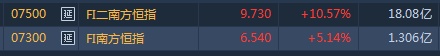 恒指反向杠杆产品获热捧,逆市放量大涨,截至发稿,FI二南方恒指(07500)涨10.57%,报9.73港元,成交额18.08亿。FI南方恒指(07300)涨5.14%,报6.54港元,成交额1.306亿。