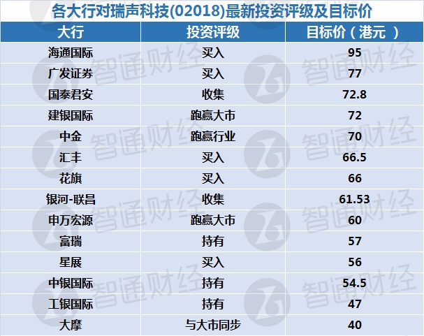 下表列出14家券商对瑞声科技的最新评级和目标价: