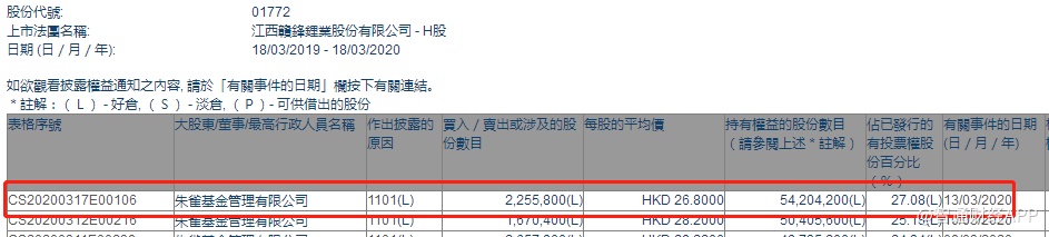 智通财经APP获悉,联交所最新资料显示,3月13日,朱雀基金增持赣锋锂业(01772)225.58万股,每股作价26.80港元,总金额约为6045.54万港元,增持后持股数目约为5420.42万股,持股比例为27.08%。