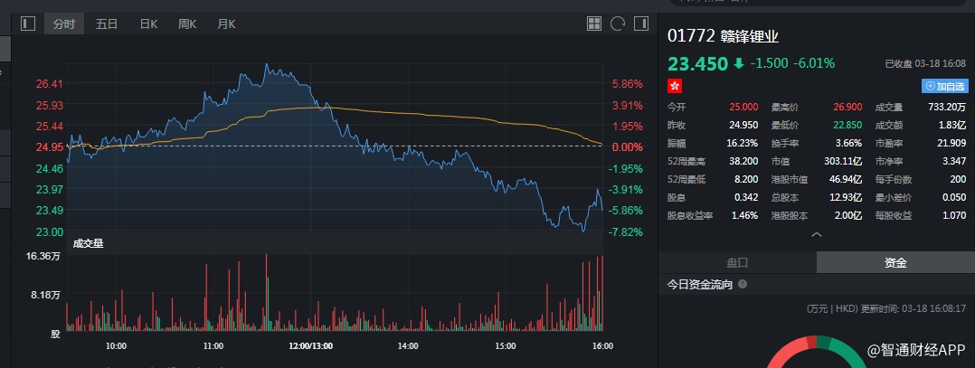 截止今日收盘,赣锋锂业(01772)跌6.01%,报23.45港元。