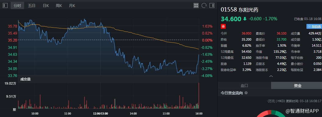 截止今日收盘,东阳光药(01558)跌1.70%,报34.60港元。
