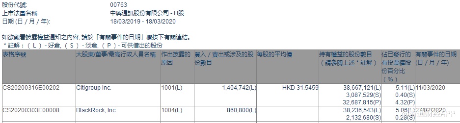 智通财经APP获悉,联交所最新资料显示,3月11日,Citigroup Inc增持中兴通讯(00763)140.47万股,每股作价31.5459港元,总金额约为4431.25万港元,增持后持股数目约为3866.71万股,持股比例为5.11%。