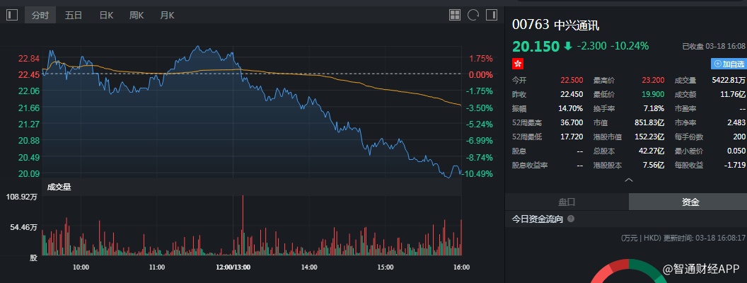 截止今日收盘,中兴通讯(00763)跌10.24%,报20.15港元。