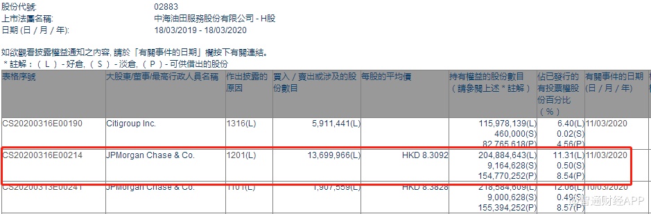智通财经APP获悉,联交所最新资料显示,3月11日,摩根大通减持中海油田服务(02883)1370万股,每股作价8.3092港元,总金额约为1.14亿港元,减持后持股数目为2.05亿股,持股比例为11.31%。
