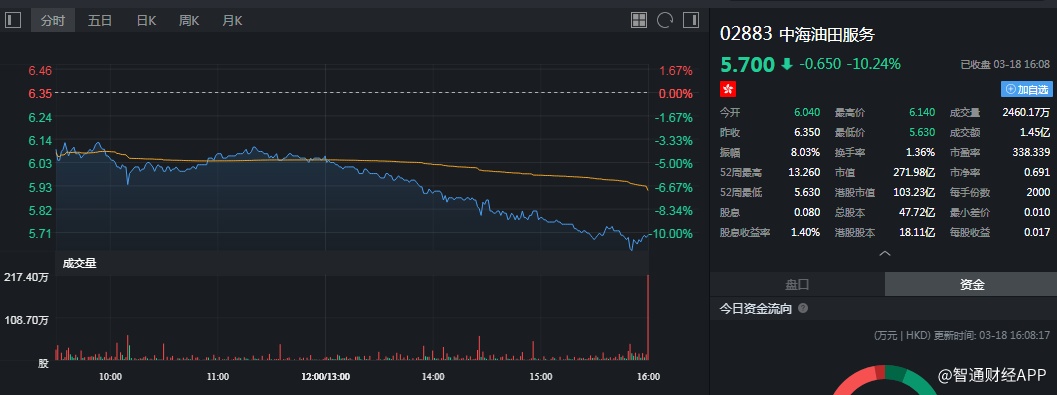 截止今日收盘,中海油田服务(02883)跌10.24%,报5.70港元。