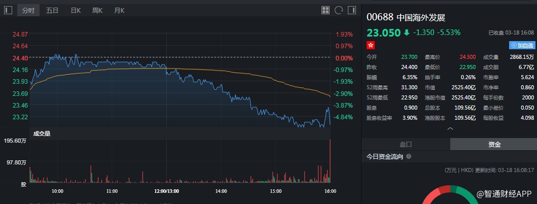 截止今日收盘,中国海外发展(00688)跌5.53%,报23.05港元。