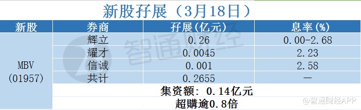 智通财经APP获悉,3月18日,MBV(01957), C-LINK SQ(01463)正在招股中。