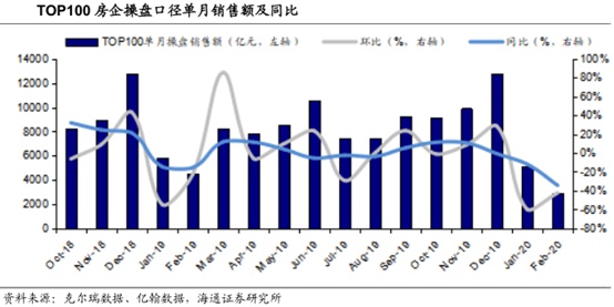 2020年公共卫生事件的爆发,直接导致地产线下销售业务的瘫痪。智通财经APP了解到,受公共卫生事件影响,全国多数地区政府部门防控通知明确房地产开发企业、经纪机构暂停商品房集中销售活动、取消房展会、发布会等各种形式的群体性活动,暂停商品房售楼处销售活动,房产中介门店暂停营业,待到事件过后再行恢复。此事件直接导致的便是各地新房销售新房销售基本停摆。2020年1-2月商品房销售面积8475万平米,同比减少39.90%,增速环比降低39.8pct;其中商品住宅销售面积为7489万平米,同比减少39.20%,增速环比下降40.7pct。而2020年2月前100强房企操盘口径销售金额为8032亿元,同比上年下降21.7%;权益金额为6753亿元,同比上年下降25.1%。2020年2月前50强房企操盘口径销售金额为6962亿元,同比上年下降19.2%;权益金额为5829亿元,同比下降22.1%。
