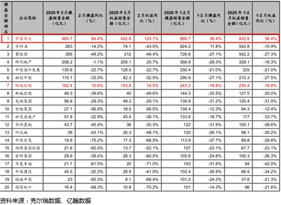 在市场一片惨淡之中,恒大强势的销售表现几乎颠覆了市场认知。根据克尔瑞数据统计,公司2月以460.7亿元的操盘销售金额、442.6亿元权益销售金额占据榜单首位,拉开第二名万科A的263亿元和74.4亿元几个身位,操盘、权益分别达到84.4%、125.1%的同比增速,更是与TOP20房企清一色大幅下滑形成了巨大反差。